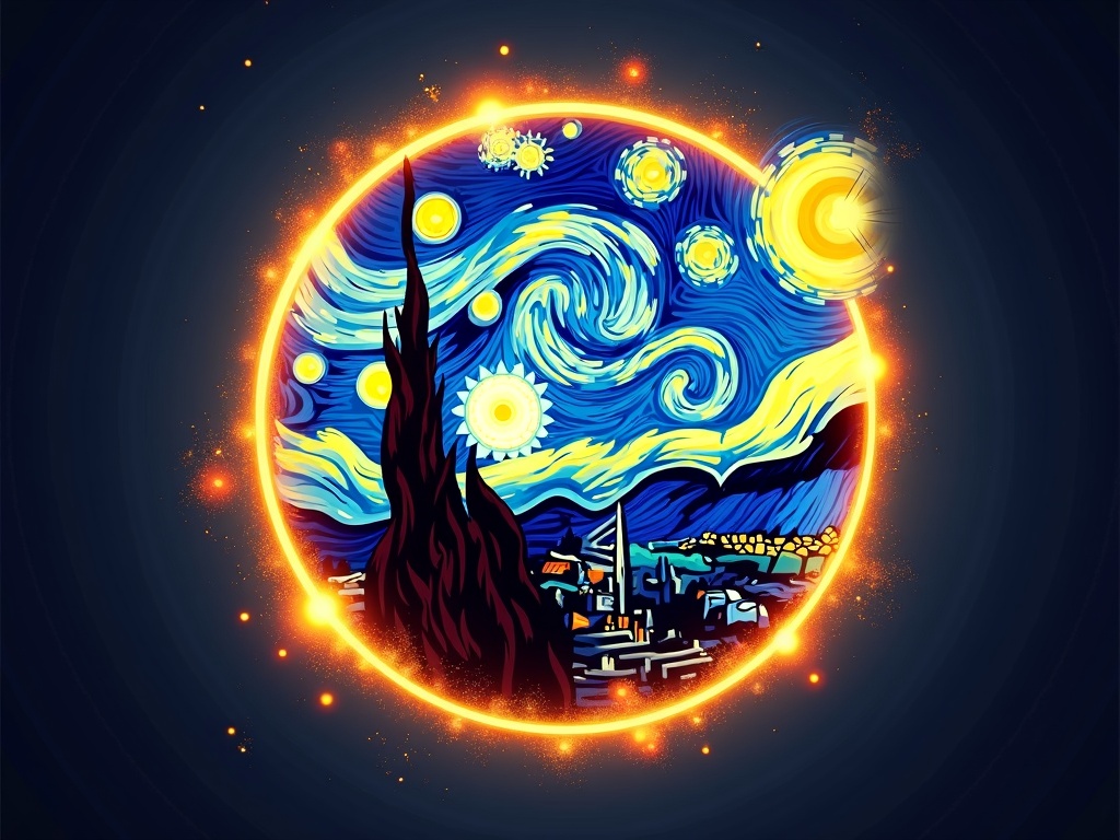 Experience Van Gogh like never before! Discover a digital portrait within a glowing circular frame, blending Starry Night's elements. A colorful fusion of art and technology awaits.