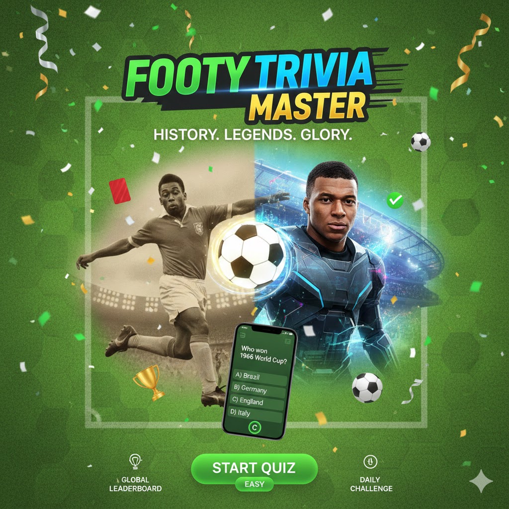 Challenge yourself with addictive multiple-choice quizzes blending classic legends (Pelé, Maradona) and today's stars (Messi, Haaland, Mbappé). How much do you really know about the beautiful game?